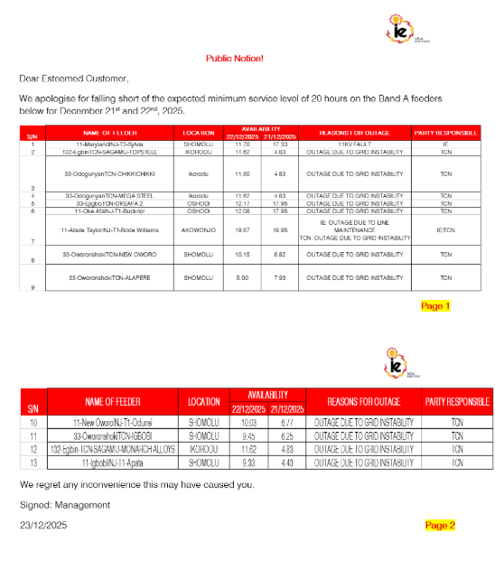 In the notice, management apologised for “falling short of the expected minimum service level of 20 hours” on the affected feeders, attributing the disruptions largely to grid instability and technical issues on the transmission network.