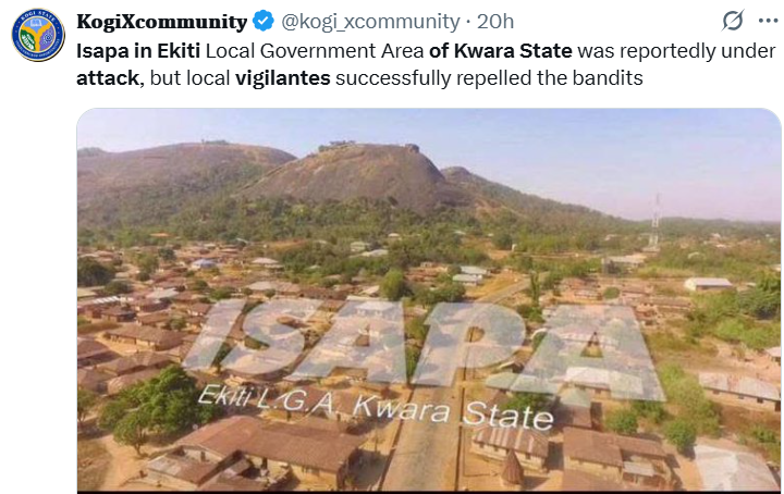 A post shared by The KogiXcommunity on its X handle, @kogi_xcommunity, reported that “Isapa in Ekiti Local Government Area of Kwara State was reportedly under attack, but local vigilantes successfully repelled the bandits.” The update circulated widely and provided additional confirmation that the volunteers had regained control of the situation by the time the information reached the public.