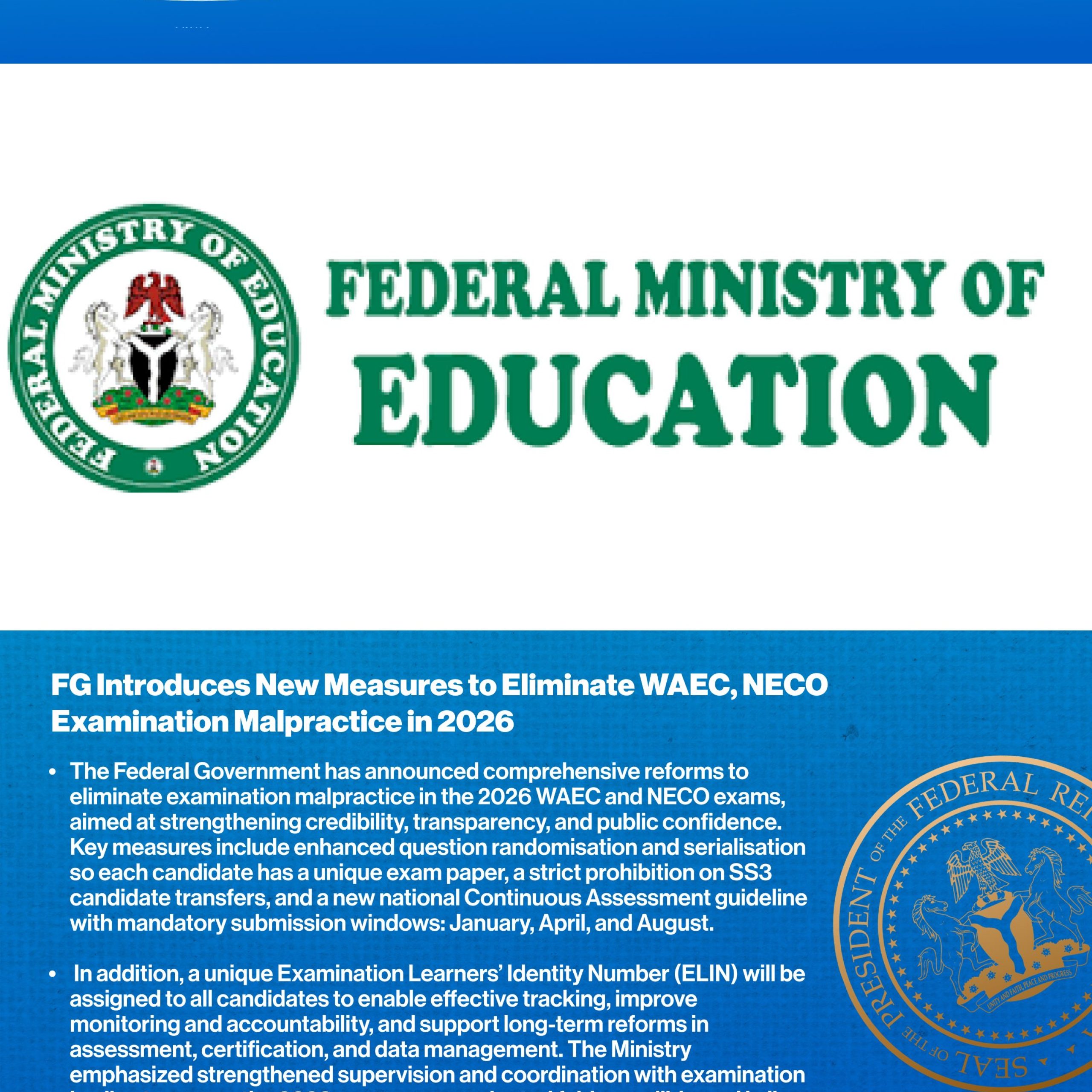 THE FEDERAL Government has unveiled a series of measures to reduce examination malpractice in the 2026 West African Examinations Council (WAEC) and National Examinations Council (NEC) exams, focusing on tighter monitoring, improved data management, and stricter compliance with guidelines.