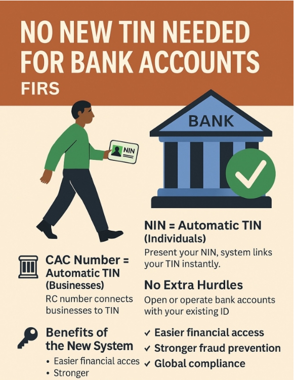 THE FEDERAL Inland Revenue Service (FIRS) has reaffirmed that Nigerians will not be required to obtain a separate Tax Identification Number (TIN) before they can open or operate bank accounts under the new framework set to take effect in January 2026.