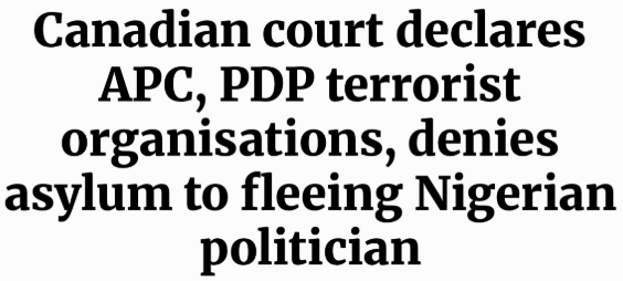 When a Canadian federal court recently declared Nigeria’s two largest political parties, the ruling All Progressives Congress (APC) and the opposition Peoples Democratic Party (PDP) as terrorist organizations under Canadian law, it wasn’t just an immigration decision.