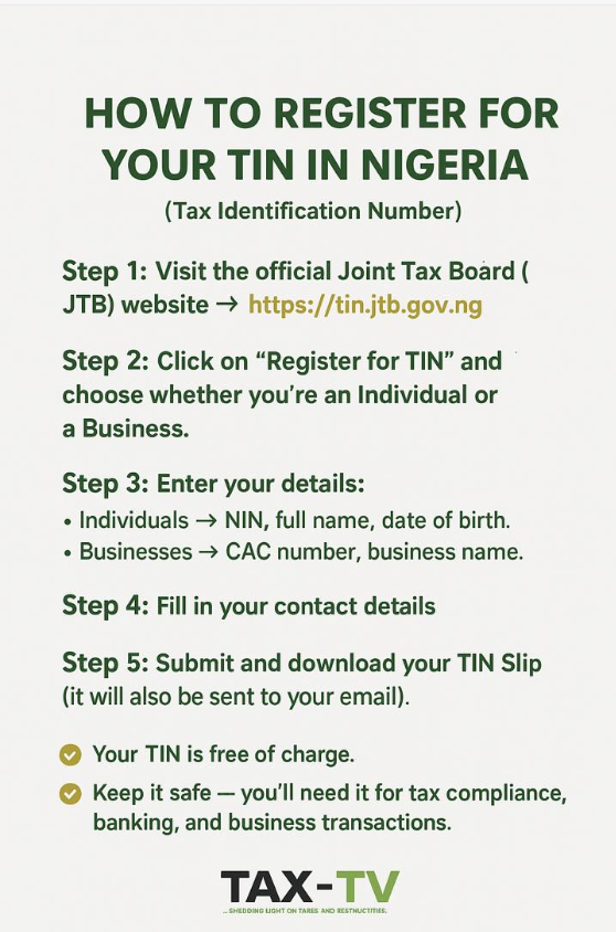 For individuals, the process begins online urging applicants to visit http://tin.jtb.gov.ng and register using either their Bank Verification Number (BVN) or National Identification Number (NIN.