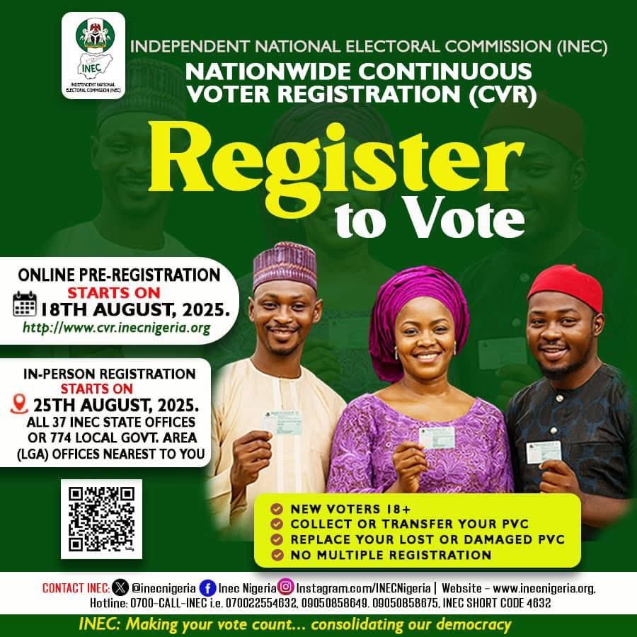 INEC says the CVR will begin with an online pre-registration phase starting 18 August 2025 through the commission’s official portal at https://cvr.inecnigeria.org, followed by in-person registration from 25 August at designated centres nationwide.