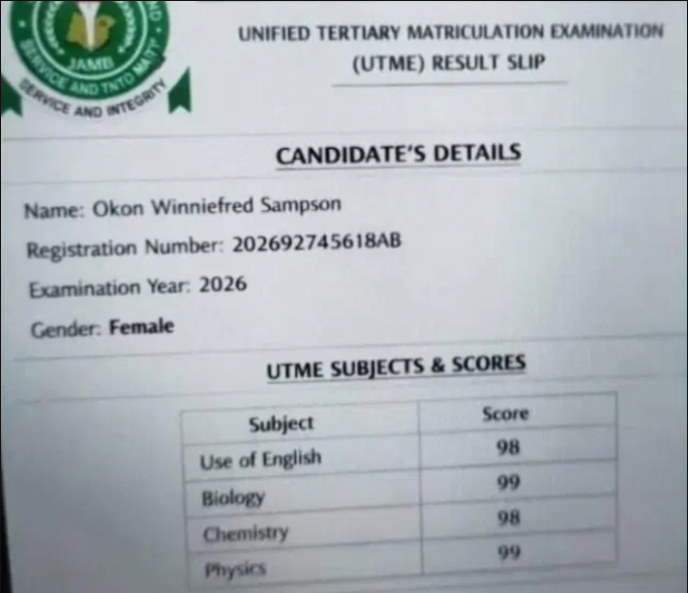 JKNewsMedia.com reports that the result, which trended on social media platform X, was shared by user @Onsogbu and claimed that a candidate, Okon Winnifred Sampson from Cross River State, scored 394 out of 400 with 96 in Use of English, 99 in Biology, 98 in Chemistry and 99 in Physics.