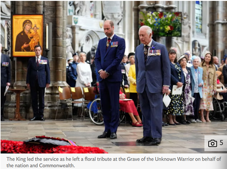 The King led Thursday’s national act of remembrance, joined by Prime Minister Sir Keir Starmer, the Prince and Princess of Wales, and 78 surviving veterans of the war, in a service of thanksgiving and reflection.
