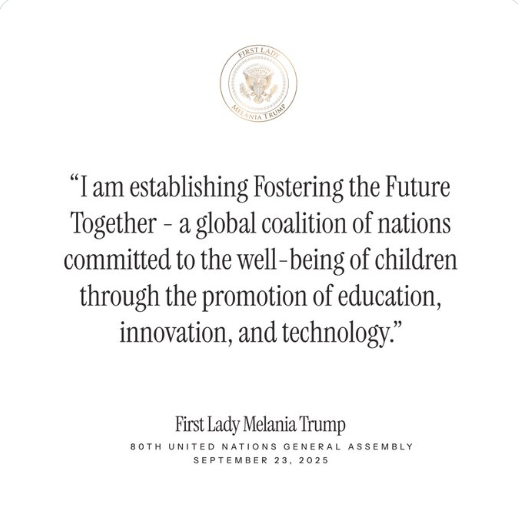 U.S. First Lady also announced that the inaugural meeting of Fostering the Future Together will be held at the White House during the first quarter of 2026, bringing together member representatives to advance the coalition’s goals.
