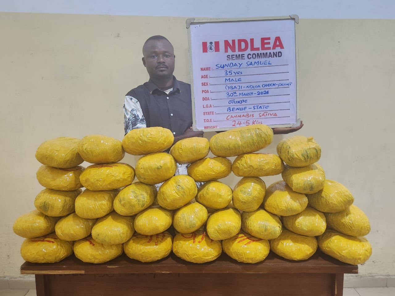 Their arrest followed the apprehension of Sunday Samuel, 35, described as a fake security agent, who was intercepted at the same checkpoint on Monday 30th March with 24.5kg of skunk.