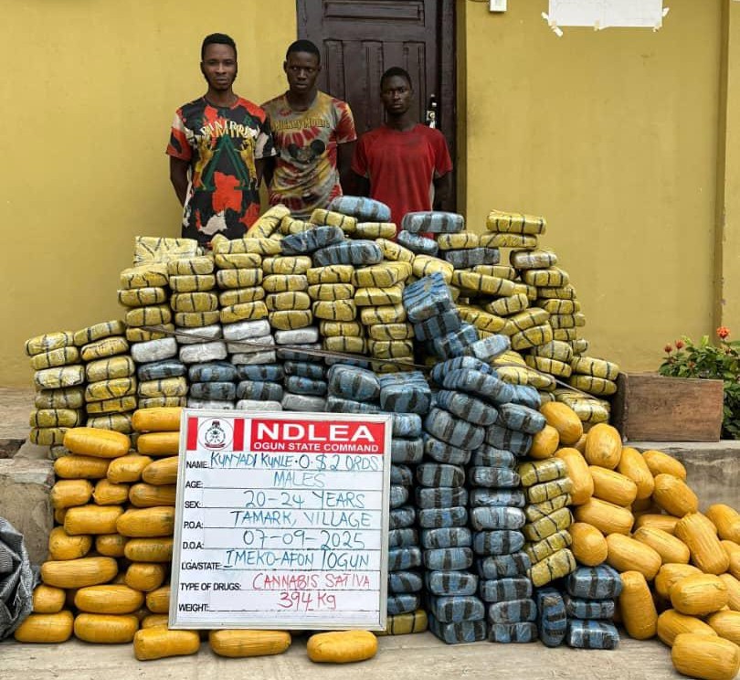 In Ogun State, NDLEA operatives working with police and local vigilantes arrested three traffickers — Kunyadi Kunle Ogbungbun, 24; Olalekan Adewale, 20; and Sanya Joshua, 22 – with 394kg of skunk at Imeko on Sunday 7th September.
