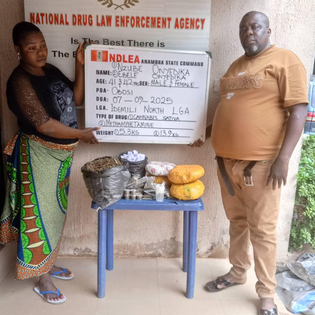 In Anambra State, operatives arrested Nzube Onyedika, 41, and his wife Ebele Onyedika, 42, during a raid at Obosi, where 13.9kg of methamphetamine and 5.3kg of skunk were recovered. Another suspect, Nnamchi Tochukwu, 36, was also arrested with quantities of methamphetamine, tramadol, swinol, heroin, and skunk.