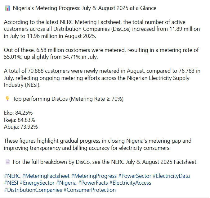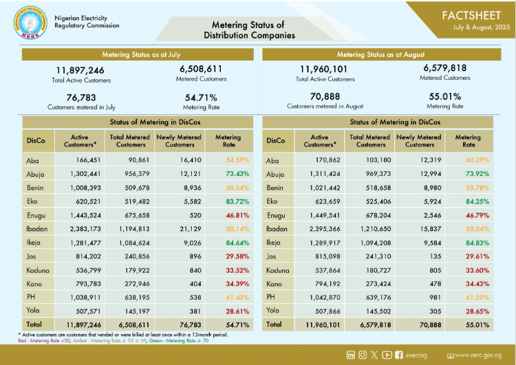 The update, published through the Commission’s verified X (formerly Twitter) and Instagram handles on Monday, came as part of NERC’s official Metering Factsheet for July and August 2025, detailing customer and metering data across the 11 electricity distribution companies (DisCos) nationwide.