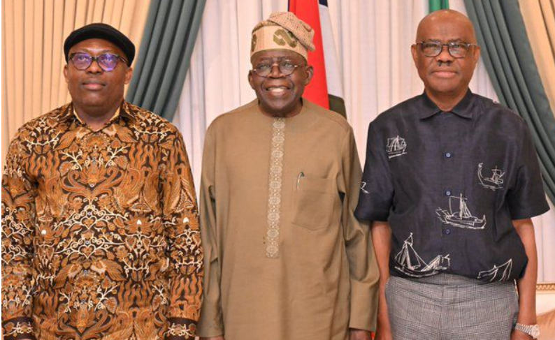 LR: Fubara, Tinubu and Wike during a meeting to broker peace between the warring factions